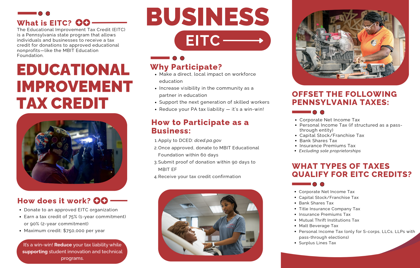 The Educational Improvement Tax Credit (EITC) is a program that allows PA businesses to earn tax credits by donating to approved non-profit organizations, like MBIT Education Foundation. It redirects state tax liability to local educational initiatives.